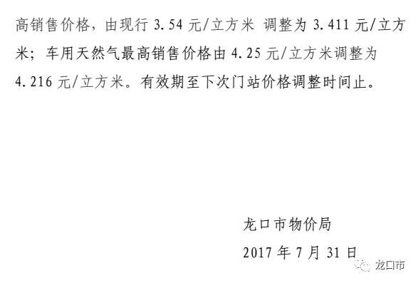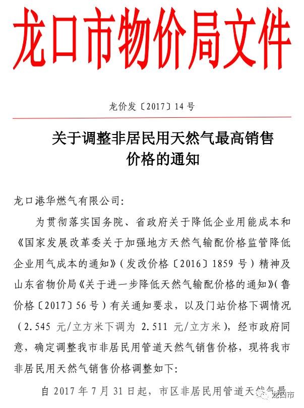 公告 | 關(guān)于調(diào)整龍口市非居民用天然氣最高銷售價格的通知