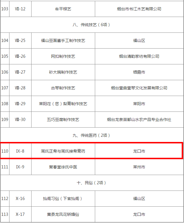 近日,煙臺市政府同意市文化廣電新聞出版局提報的第五批市級非物質文化遺產名錄(新入選項目16項、擴展項目6項),現予公布,其中龍口冶基骨科(龍口周世中醫診所)的周氏正骨和接骨膏藥技藝入選傳統醫藥類的非物質文化遺產名錄!