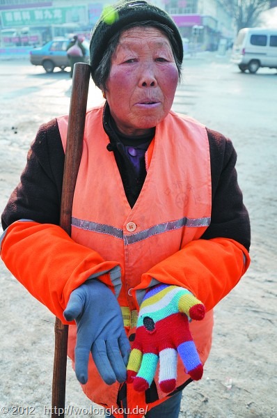 67歲的顏克花老人手上戴了一雙顏色和型號都不相同的手套,其中一個手套上還磨破了一個洞。老人告訴記者,手套是她清掃垃圾的時候撿的,“湊起來正好是一雙,還挺保暖的。”談話間,老人不好意思地將手套摘下來攥在手里藏在了身后。